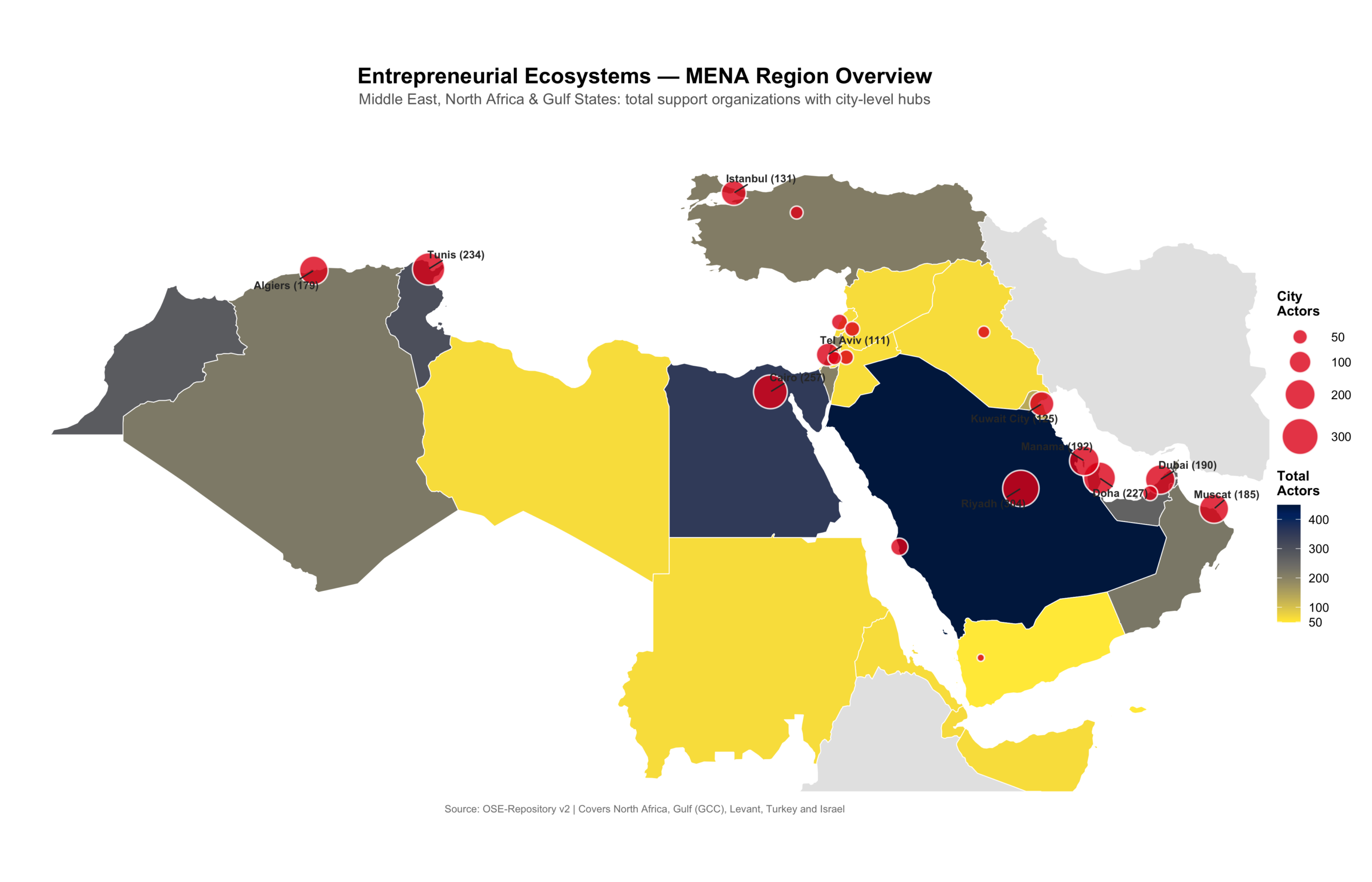 By integrating Ecosystem Mapping and Evaluation, we provide a detailed, visual representation of the ecosystem’s structure, identifying not only the key actors but also their specific roles, relationships, and resource flows. This offers granular insights into how the macro-environment influences and is influenced by local networks, providing a deeper understanding of the underlying dynamics that drive entrepreneurial activity.